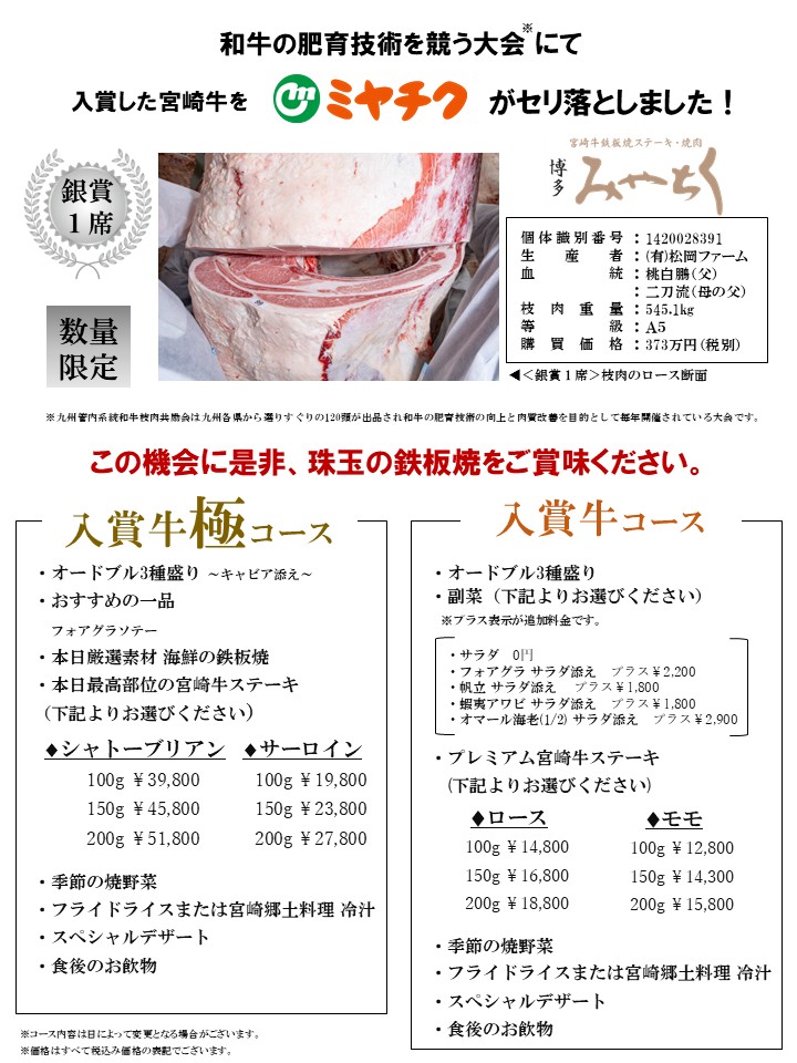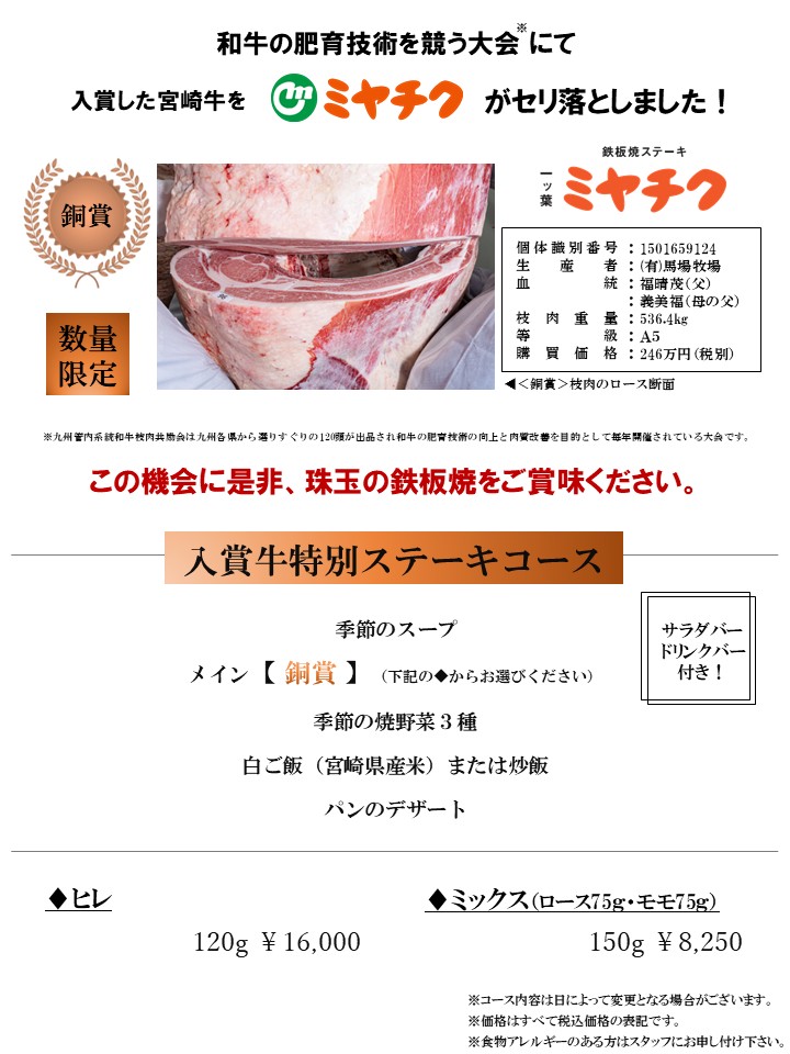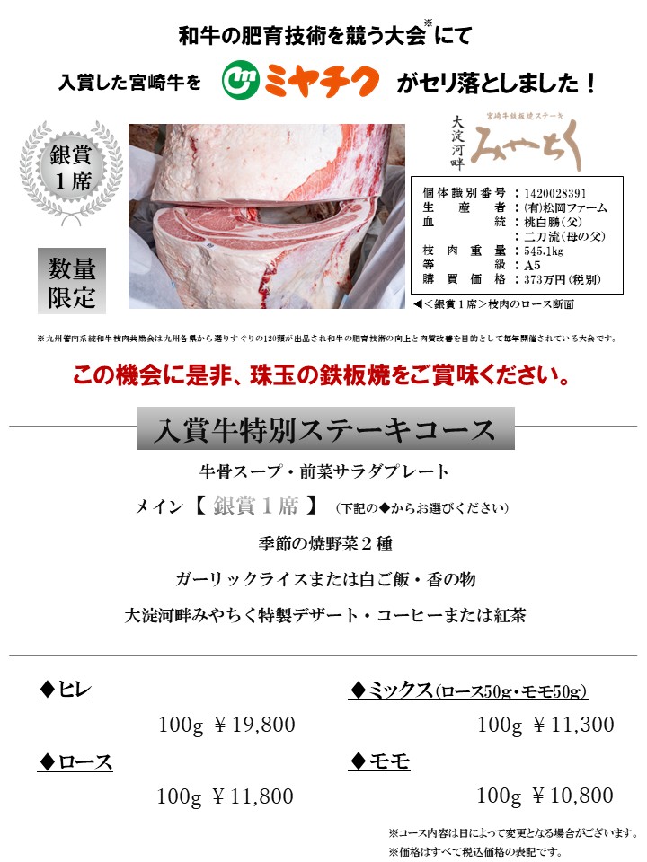 | 営業時間 | ランチ 11:00~15:00(L.O.14:00/ステーキコースは13:30までの受付) ディナー 17:00~22:00(L.O.21:00/ステーキコースは20:30までの受付)  |